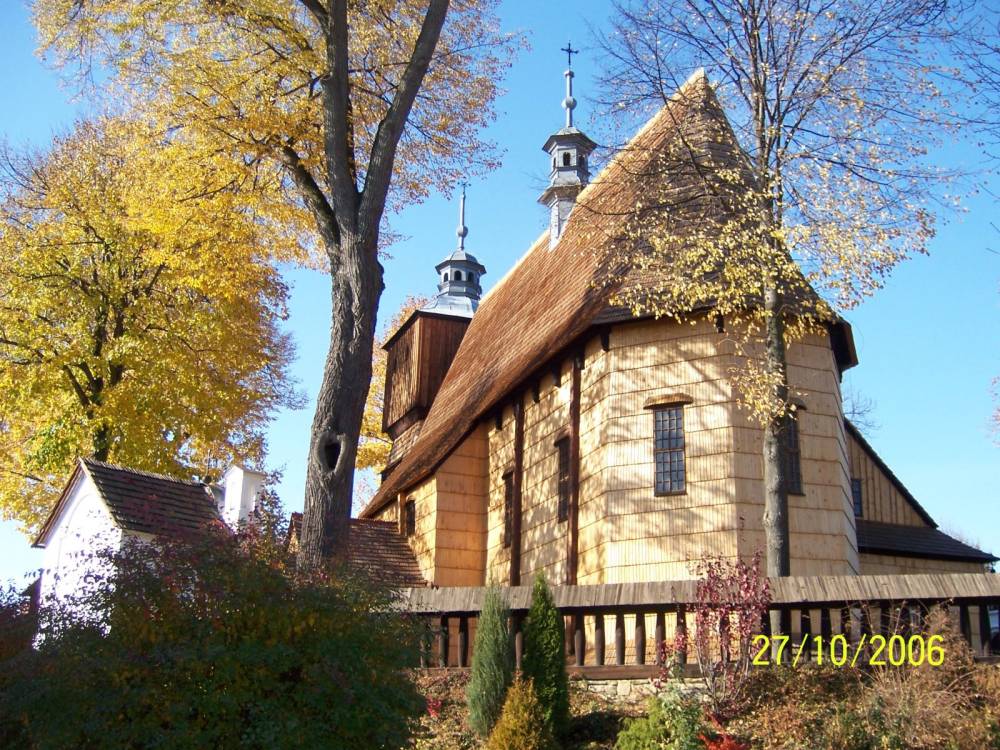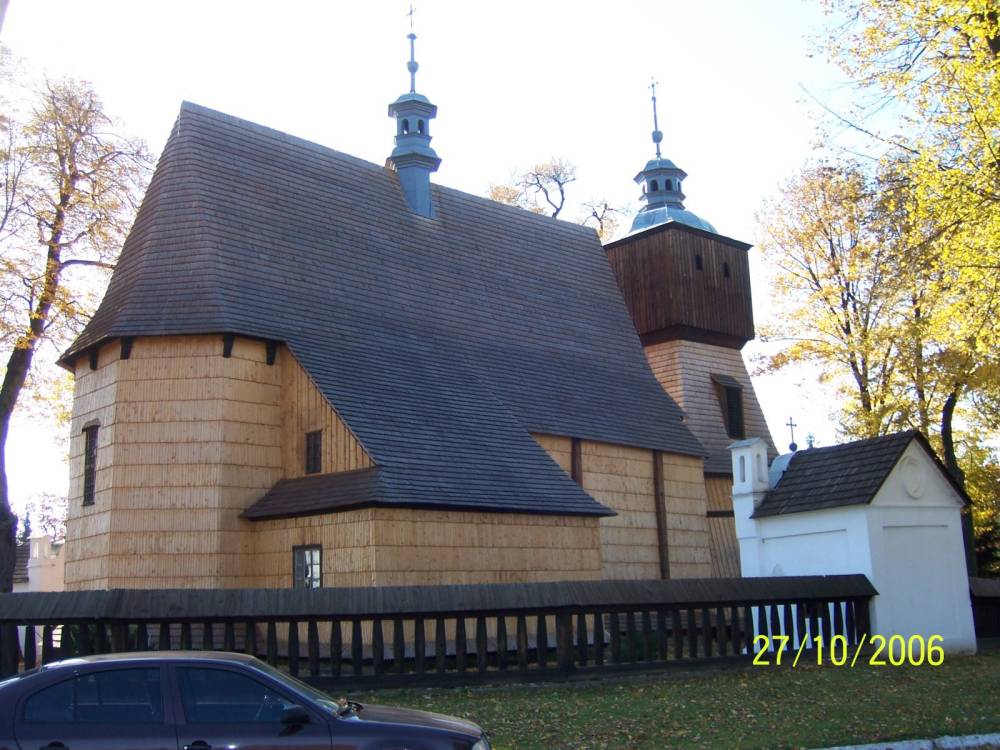 Budynek kościoła przechodził jeszcze wiele przeobrażeń. W drugiej połowie XVII wieku dodano soboty na całym obwodzie, sięgające dolnych krawędzi okien. Na dachu dodano wieżyczkę na sygnaturkę. Obecna, powstała po zniszczeniu starej przez wichurę, pochodzi z 1745. W tym czasie dobudowano w wieży obszerny babiniec i powiększono główne wejście. W 1811 roku przeprowadzono kompleksowy remont świątyni, który znacznie zmienił jej bryłę: rozebrano soboty, oszalowano gontem całe ściany zewnętrzne, powiększono i podwyższono zakrystię. Do południowej elewacji nawy dostawiono obszerną kruchtę, która osłoniła południowe wejście i powiększyła przestrzeń użytkową. Od 1811 roku nie wprowadzono znaczących zmian w bryle kościoła, prowadzono jedynie prace przy wymianie gontów, naprawy ciesielskie. Plac wokół kościoła ogrodzono drewnianym parkanem z czterema murowanymi kapliczkami odpustowymi, które powstały około połowy XIX wieku.