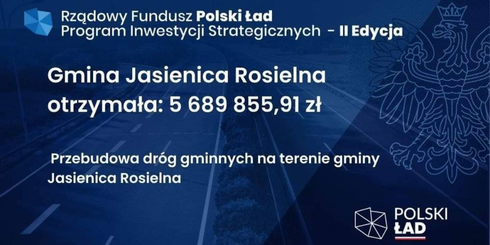 Jest nam niezmiernie miło poinformować, że Gmina Jasienica Rosielna otrzymała ponad 10 400 000 zł z Rządowego Funduszu Polski Ład Program Inwestycji Strategicznych – II edycja na przebudowę dróg gminnych.