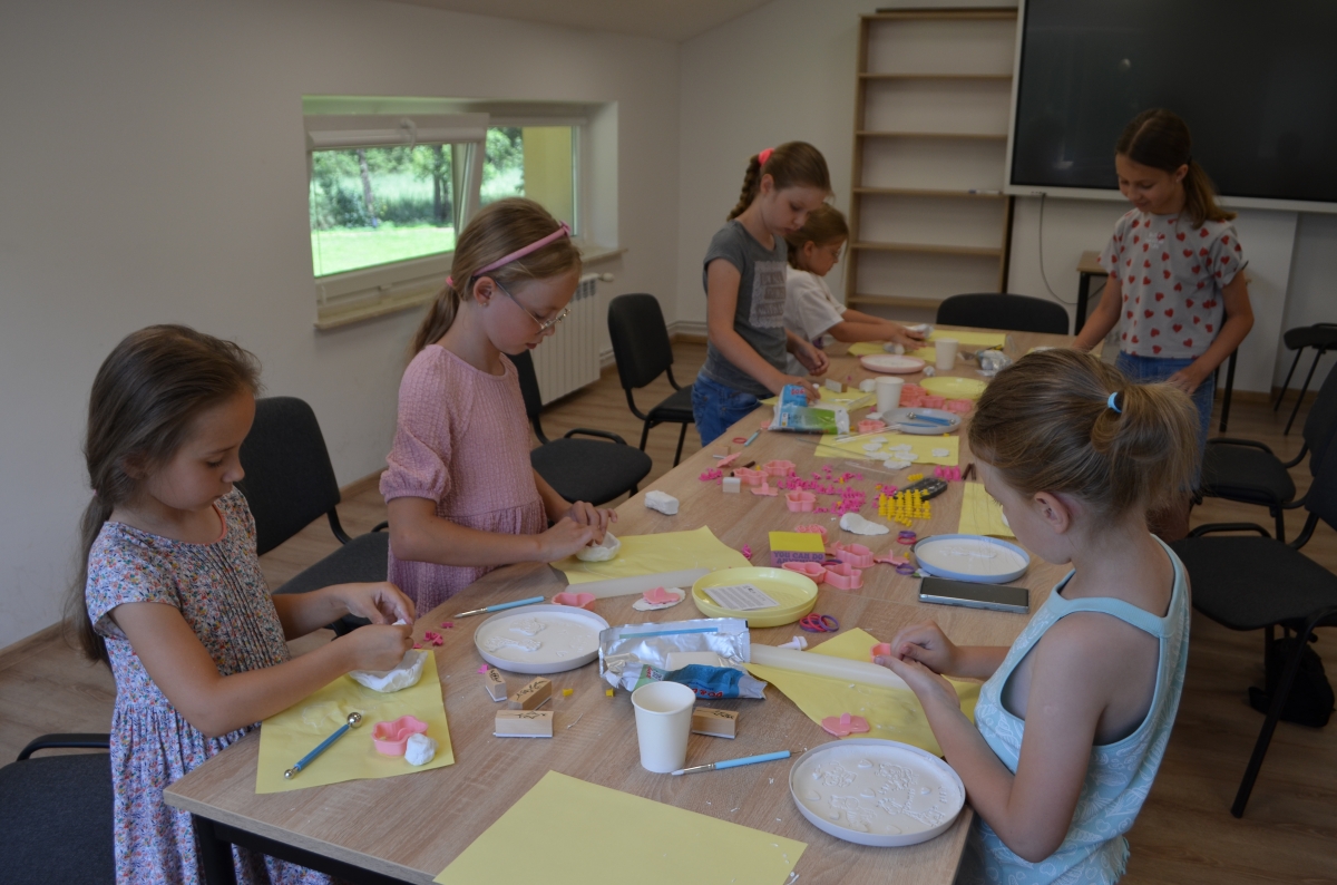 Najmłodsi mieszkańcy gminy spełnić się mogli także w realizowanych we wszystkich placówkach centrum warsztatach kreatywnych i plastycznych wykonując organizery na przybory szkolne, kukiełki na patyku, flakoniki wyklejone włóczką, kolorowe motylki, lampiony, składane samoloty, prace z masy plastycznej i glinki oraz niezwykłe obrazki z zasuszonych kwiatów i traw. Wszelkie formy rozwijania talentów i uzdolnień plastycznych potwierdziły, że dzieci posiadają bogatą wyobraźnię, potrafią osiągnąć precyzję i wyćwiczyć zdolności manualne, a przede wszystkim współdziałać w miłej atmosferze.